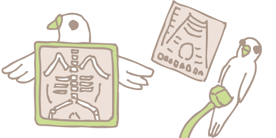 当院では体のつくりや習性を熟知した獣医師ができるだけストレスをかけない診察を行っています。当院で行う検査は糞便検査、そのう検査、X線検査、超音波検、血液検査、感染症の遺伝子検査などがあります。診察、検査、治療は一羽ごとに状態と性格を考慮して行います。